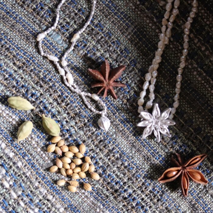 父の真珠をインドとか大航海時代というキーワードとつなげて整理したい!と思ったときに相談したのは、シンガポール時代の博物館ガイド仲間。これまでもKOELの記事やイベントを手伝ってもらっていたが、中でもioraとMeiはジュエリーを作る人たちでもあった、という偶然&幸運!シルバークレイを手がけるioraは、カラスガイ真珠に合わせてカルダモンや八角を、布好きのMeiはローマンガラスやラピスラズリとの組み合わせで東南アジアやインドのテキスタイルみたいな雰囲気のネックレスを作ってくれている。