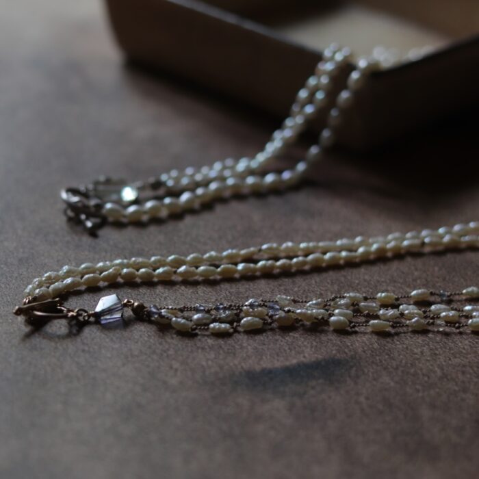 ローマンガラス。古代ローマで作られたガラスのこと。それがアフガニスタンやイランで、しかも銀化と呼ばれる美しい変化を伴って出土する。もうそれだけでわくわくする。そのローマンガラスのビーズと真珠と組み合わせたのがこちら。もちろん、ほんのかけらで高価なものでもないけれど、このネックレスには私たちのわくわくな気分がいっぱい詰まってる!そんなふうに思ってもらえたらうれしい。
